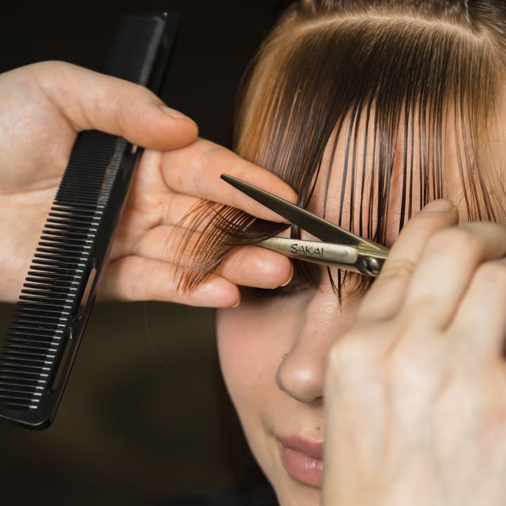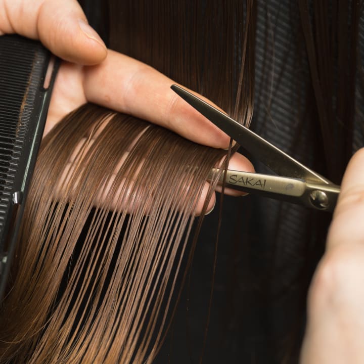 Lyhyiden hiusten leikkaus saksitekniikalla. Tai vain latvojen tasaus. Sisältää hiusten pesun ja kuivauksen.